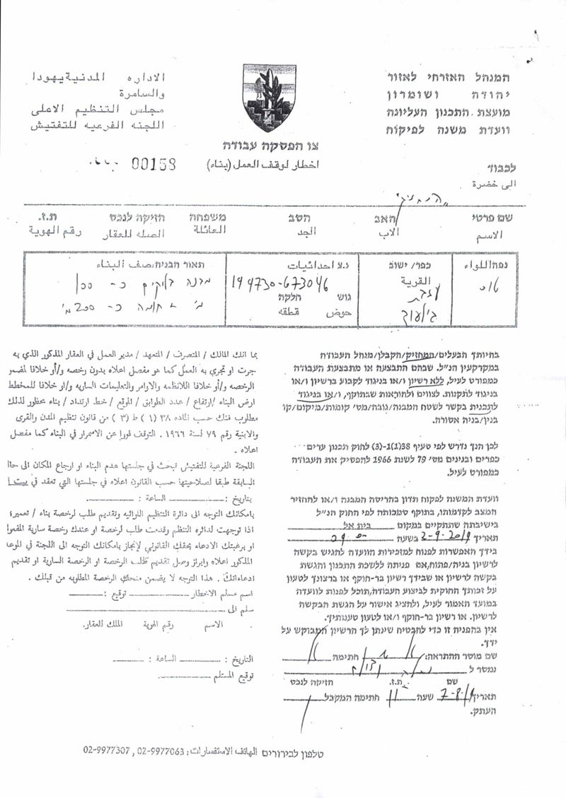 Israeli military order 92, issued on August 15th, 1967 (just two months after the order by which Israel had claimed full military, legislative, executive, and judicial control of the West Bank on June 7th), placed all authority over water resources in the hands of an Israeli official. Military order 158, issued on November 19th of the same year, declared that no one could establish, own, or administer any water extraction or processing construction (such as wells, water purification plants, or rainwater collecting cisterns) without a new permit. Water infrastructure could be searched for, confiscated, or destroyed at will of the Israeli military. This order de facto forbid Palestinians from owning or constructing any new water infrastructure, since anyone could be denied a permit without reason; to date, no West Bank Palestinian has ever been granted a permit to construct a well to collect water from an aquifer.